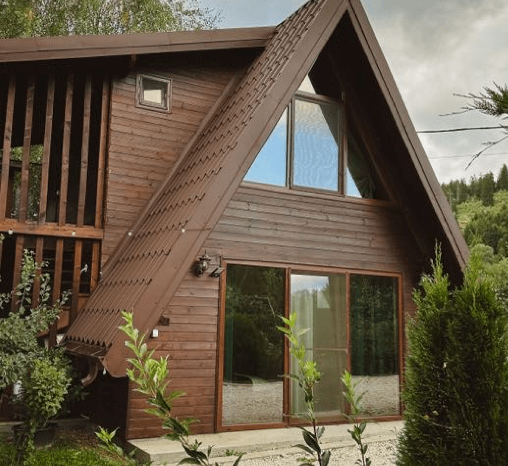 Două cabane „tip A” – structuri de lemn, cu ferestre generoase spre pădure şi cerul de munte.